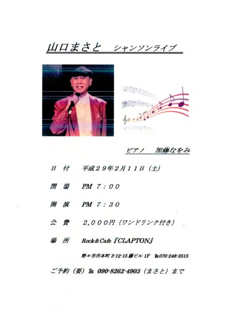2月11日(土) オープン19:00 スタート19:30 『 山口まさと シャンソンLIVE 』 CLAPTON 2度目の山口まさとシャンソンライブ 出演 山口まさと ピアノ 加藤なをみ ミュージックチャージ 2,000円(ワンドリンク付)