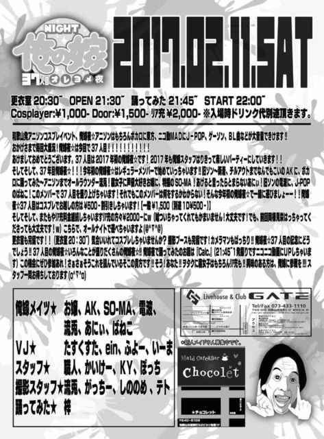 2017,2.11 SAT更衣室20:30~ OPEN 21:30~ 踊ってみた 21:45~ START 22:00~ Cosplayer:\1,000- Door:\1,500- リア充\2,000- ※入場時ドリンク代別途頂きます。 俺嫁メイツ★ お嬢、AK、SO-MA、電波、流兎、あにぃ、ばねこ、 marie VJ★ タスクスタン、ein、ふよー、いーま 、marie スタッフ★ 職人、かいけー、KY、ぼっち 撮影スタッフ★ 流兎、がっちー、しののめ、テト 踊ってみた★ 梓 37人目踊ってみたは 【Calc.】 和歌山発アニソンコスプレイベント、俺嫁夜☆アニソンはもちろんボカロに東方、ニコ動MADにJ−P