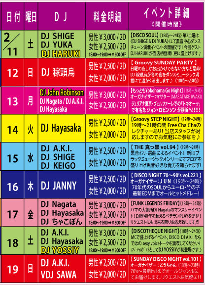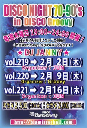 【おなじみGroovyのディスコナイト】70年代のSOULミュージックから最新のEDMまでオールヒットメドレー!踊れる曲盛り沢山でお贈りします♬ 【オーガナイザー】JUN 【DJ】JANNY(MAHARAJA ROPPONGI) 【音楽】ALL GENRE (SOUL、竹の子、ダンクラ、EURO、HI-NRG、TECHNO、R&B、EDM、etc…) 【開催時間】 19:00〜24:00 【料金】 男性:¥2,500/2Drinks+ビュッフェ付 女性:¥2,000/2Drinks+ビュッフェ付 (ビュッフェは数量限定につき無くなり次第終了となります)