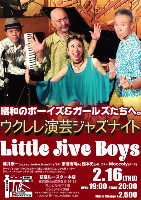 2/16(木) 荻窪ルースター ウクレレ演芸ジャズナイト 19時オープン 20時スタート CHARGE:2500円 リトルジャイブボーイズ:藤井康一(vo.sax.ukulele.fromウシャコダ) 恵福浩司(b) 照本史(pf) ゲスト:Moccoly(ダンス)