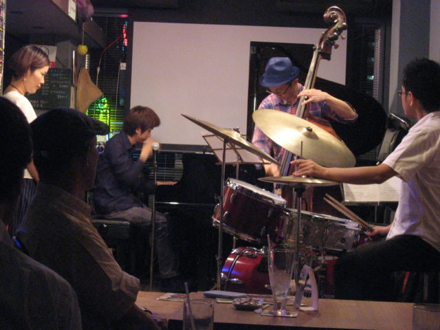 北風ピープー吹いてますが、岩崎壮平(p)さん、上杉優(tb)さん、吉田豊(b)さん、田村陽介(ds)さんの若いカルテットの登場です。 岩崎さんは、h.s.trashではすっかりお馴染み。流麗なピアノを聴かせてくれる有望若手ミュージシャンです。 トロンボーン奏者にして、シンガーでもある上杉さんは、高校時代にオーストラリアに留学してジャズと出会い、大学卒業後、ブラジルとNYで武者修行した女丈夫です。 同じくトロンボーン奏者の駒野逸美さんとのユニット「ボンボーンズ」で、高い評価を得ています。 吉田さんは、2004年横浜ジャズプ
