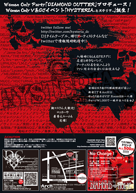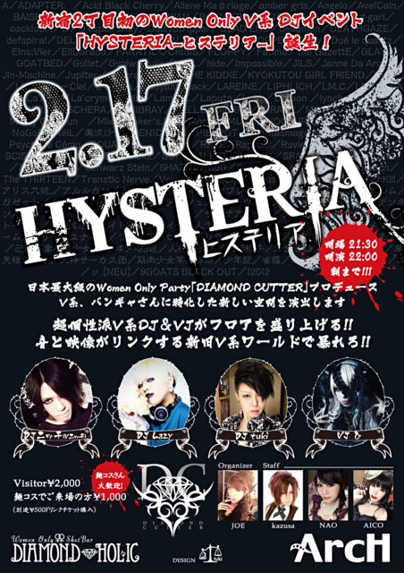 新宿2丁目初のWomen Only V系DJイベント「HYSTERIA-ヒステリア-」誕生! 日本最大級のWomen Only Party「DIAMOND CUTTER」プロデュースでV系、バンギャさんに特化した新しい空間を演出します。 麺コスさん大歓迎!麺コスでご来場の方は入場料ディスカウント!! 超個性派V系DJ&VJがフロアを盛り上げる!! 音と映像がリンクする新旧V系ワールドで暴れろ!! 会場は吹き抜けの螺旋階段が美しい新宿2丁目ArcH☆ ゆったり座れるVIP Roomはお一人様チャージ¥1,000で一晩中出入り自由♪ 麺コスさんにも嬉しいロッカーや着替えルームも完備で安心♪