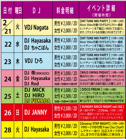 DISCO Groovy 2月の第4水曜日は【HIT TUNE MIX PARTY】SOUL、FUNK、DANCE CLASSICS、70's〜最新HIT曲までMusic Videoを織り交ぜつつかけまくります!リクエストにも出来る限りお応え致しますのでDJまでお気軽にどうぞ♪ 【音楽】 オールジャンル・オールミックス 【開催時間】 19:00〜24:00 【料金】 男性:¥2,500 / 2Drinks+ビュッフェ付 女性:¥2,000 / 2Drinks+ビュッフェ付 (ビュッフェは数量限定のためなくなり次第終了となります。ご了承ください) 【DJ's】 Hayasaka / ちゃこぼん