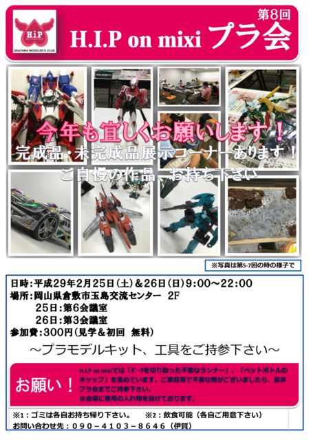 皆さん、お疲れ様です。 副管理人のネオです。 2017年もプラ会をどうぞよろしくお願いいたします。 新しい年になりましたので今年は暫くの間(いつの間にかフェードアウトするかもw) 土日セットで行います。!!! 日時:平成29年2月25日(土曜日) 9時〜22時(13H) いつ来て帰ってもOKです。 場所:倉敷市玉島 「玉島交流センター」:2F 第6会議室 会費:300円(初めての方、未成年者、見学、談話の方無料) ※椅子は十分に用意しておrますが机は少なめです。