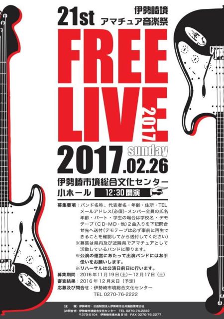 今回で21回目を迎える 歴史あるイベントの御案内です 21st伊勢崎境アマチュア音楽祭 FREELIVE2017 伊勢崎市境総合文化センター小ホール 0270-76-2222 伊勢崎市境木島818 2017年2月26日(日) 13:30開演 入場無料 12:40 ふーんそうなんだ(高校生バンド) 13:20 うさぎプルティーノ(YUKIコピー) 14:10 じゃすみん(POPSコピー) 14:50 Incentive(高校生バンド) 15:30 清徳学園(洋楽コピー) 16:10 超飛(Superflyコピー) 全6バンドが、境町を盛り上げます イスもあって落ち着いて見れますので お時間のございます方は