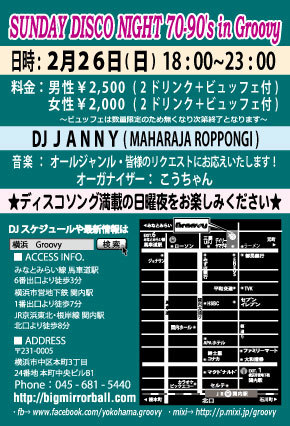 £²·î¤âÂ裳¡õÂ裴¤ÎÆüÍËÆü¤Ë³«ºÅ¤È¤Ê¤ê¤Þ¤¹¡ÚSUNDAY DISCO NIGHT¡ÛÆüÍËÆü¤Ë¤·¤«¤ª½Ð¤«¤±¤Ç¤¤Ê¤¤Êý¡¹¤Ê¤É¡¢µÙÆü¤Ç¤âDISCO¤ÊNIGHT¤ò¸ʬ¤Ë¤ª³Ú¤·¤ß¤¤¤¿¤À¤±¤Þ¤¹(^_-)-¡ù♬ ¡Ú¥ª¡¼¥¬¥Ê¥¤¥¶¡¼¡Û¤³¤¦¤Á¤ã¤ó ¡ÚDJ JANNY¡ÊMAHARAJA ROPPONGI¡Ë¡Û ¡Ú²»³Ú¡Û¥ª¡¼¥ë¥¸¥ã¥ó¥ë ¡ÊSOUL¡¢Ãݤλҡ¢EURO¡¢HI-NRG¡¢R&B¡¢etc... ³§ÍͤΥꥯ¥¨¥¹¥È¤Ë¤ª±þ¤¨¤·¤Þ¤¹¡ª¡Ë ¡Ú³«ºÅ»þ´Ö¡Û18:00¡Á23:00 ¡ÚÎÁ¶â¡Û ÃËÀ¡§¡ï2,500/2Drinks¡Ü¥Ó¥å¥Ã¥Õ¥§ÉÕ ½÷À¡§¡ï2,000/2Drinks¡Ü¥Ó¥å¥Ã¥Õ¥§ÉÕ ¡Ê¥Ó¥å¥Ã¥Õ¥§¤Ï18»þ¤è¤ê¤´ÍѰդ·¤Þ¤¹¤¬¿ôÎ̸ÂÄê¤Ë¤Ä¤Ìµ¤¯¤Ê¤ê¼¡