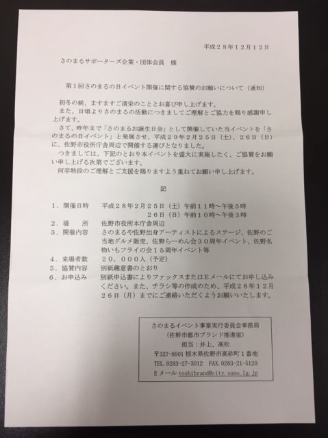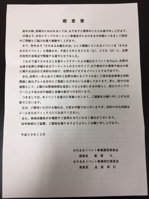 平成29年 2月 25日 26日にさのまるの誕生会改めてさのまるの日が佐野市で行われることになりました。 そこで日頃からお世話になっているさのまる。佐野市にどんどん隊として協力をしたいと考えています。 ご協力頂ける方は参加表明お願いします。