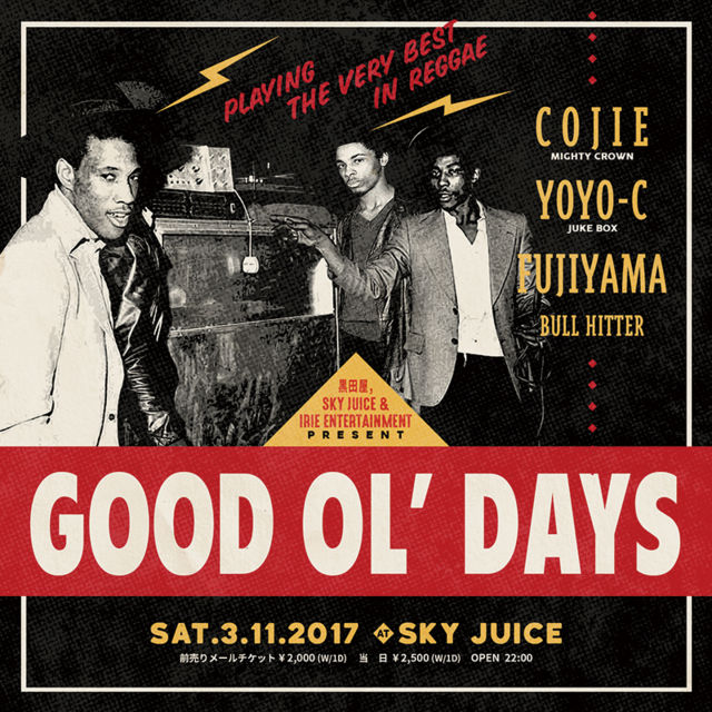 ¹ðÃμºÎ餷¤Þ¤¹¡£ ¢¨Ë¶¶SKY JUICE¤Ë¤Æ³«ºÅ¡ª -¹õÅIJ° & SKY JUICE & IRIE ENTERTAINMENT Presents- ¡ÖGOOD OL' DAYS¡× ¡ÉPLAYING THE VERY BEST IN REGGAE¡É <³«ºÅÆü»þ> 2017ǯ3·î11Æü(ÅÚ) OPEN/22:00 <²ñ¾ì> SKY JUICE °¦Ãθ©Ë¶¶»Ô¾¾ÍÕÄ®1-14 B1 0532-54-4554 <ÎÁ¶â> Mail Ticket:2,000yen(1DÉÕ) Door:2,500yen(1DÉÕ) Mail Ticket Adress : skyjuice0001@yahoo.co.jp ¢¨¥á¡¼¥ë¥Á¥±¥Ã¥È¼èÆÀ´ü¸Â¡§2017ǯ3·î10Æü(¶â) <½Ð±é> ¡¦COJIE¡¡from MIGHTY CROWN ¡¦YOYO-C from JUKE BOX ¡¦FUJ