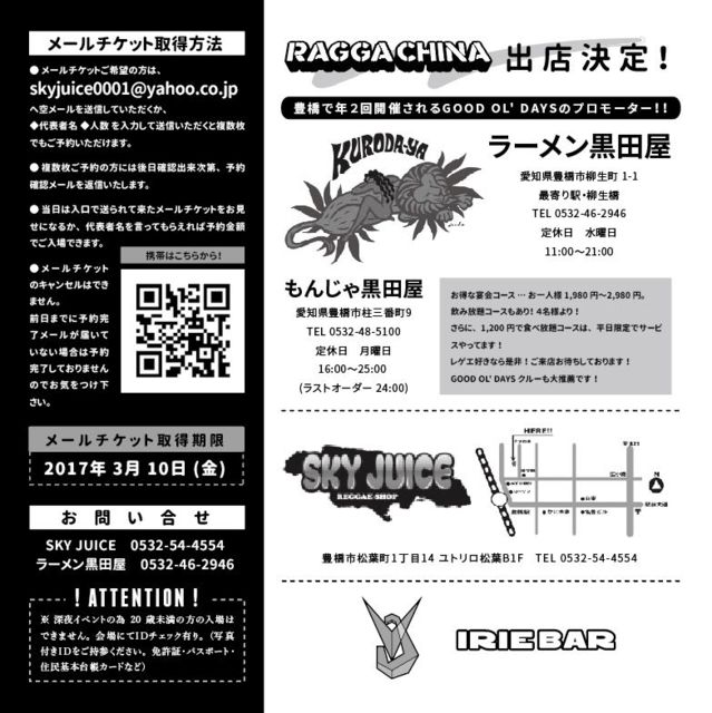 -¹õÅIJ° & SKY JUICE & IRIE ENTERTAINMENT Presents- ¡ÖGOOD OL' DAYS¡× ¡ÉPLAYING THE VERY BEST IN REGGAE¡É <³«ºÅÆü»þ> 2017ǯ3·î11Æü(ÅÚ) OPEN/22:00 <²ñ¾ì> SKY JUICE °¦Ãθ©Ë¶¶»Ô¾¾ÍÕÄ®1-14 B1 0532-54-4554 <ÎÁ¶â> Mail Ticket:2,000yen(1DÉÕ) Door:2,500yen(1DÉÕ) Mail Ticket Adress : skyjuice0001@yahoo.co.jp ¢¨¥á¡¼¥ë¥Á¥±¥Ã¥È¼èÆÀ´ü¸Â¡§2017ǯ3·î10Æü(¶â) <½Ð±é> ¡¦COJIE¡¡from MIGHTY CROWN ¡¦YOYO-C from JUKE BOX ¡¦FUJIYAMA ¡¦BULL HITTER <½ÐŹ¥Ö¡¼¥¹> ¥é¥¬¥Á¥ã