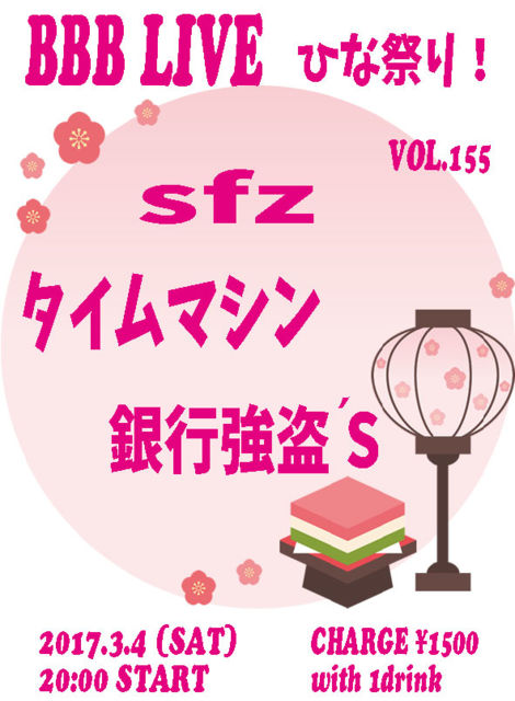 BBB LIVE 155 ¤Ò¤Êº×¤ê¥é¥¤¥Ö¡ª 2017.3.4 (SAT) 20:00 START CHARGE \1500 with 1drink ¡ù¡¡sfz ¡ù¡¡¥¿¥¤¥à¥Þ¥·¥ó ¡ù¡¡¶ä¹Ô¶¯Åð¡ÇS