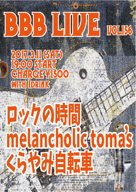 BBB LIVE 156 2017.3.11 (SAT) 19:00 START CHARGE \1500 with 1drink ¡ù¡¡¥í¥Ã¥¯¤Î»þ´Ö ¡ù¡¡melancholic toma's ¡ù¡¡¤¯¤é¤ä¤ß¼«Å¾¼Ö