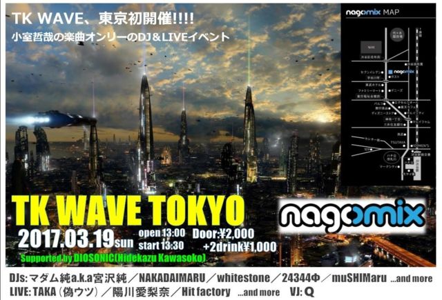 いよいよ「TK WAVE」が東京進出!!!! 関西で著しい盛り上がりを見せている、小室哲哉氏の楽曲Onlyで構成されるDJ&ライブイベント「TK WAVE」が、nagomix渋谷様ご協力のもと東京で開催決定となりました!! TM NETWORKの3人が公認するTK WAVE主催者『TAKA(偽ウツ)』を始め、関西から熱いTK WAVEメンバーが参加!そして東京で活躍しているFANKS、そしてglober、あるいはTK Loverな出演者たちが渋谷を思い切り盛り上げます!! 巨大スクリーンと充実の音響&照明を誇るnagomixを駆使して浴びる大音量のTKサウンド…! 本気の遊びがそこに集結しま