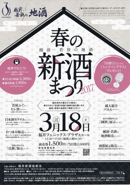 福井県福井市で開催されます。 今年で9年目の開催になります。 例年、2000人の来場者で賑わう華やかな楽しいイベントです。 前売券1500円(当日券2000円)で、福井県内の24の蔵元の美味しい新酒(日本酒)が飲み放題です。 外国人の方への対応も充実しています。 近くの方も、遠方の方も、どうぞ皆さま、奮ってご参加くださいませ。