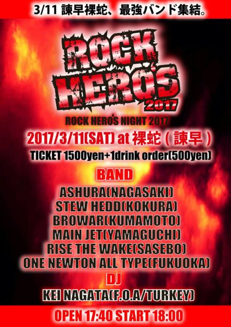 BAND LIVE D.R.P PRESENTS "ハイブリッド バトルツアー2017" 3/19(日)長崎 諫早裸蛇 OPEN 17:30/START 18:00 ADV ¥2500/DOOR ¥3000(別途ドリンク代) <PERFORMERS> KENZI&THE TRIPS FUNGUS THE LEAPS THE COMIN' 暴走ライン +2バンド (問)裸蛇 0957-24-1787 <備考> 6歳児以上チケット必要