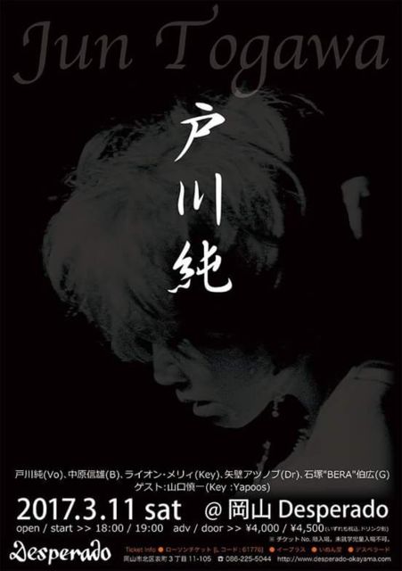 今年もやります!チケット発売中! ★3/11(土)岡山DESPERADO(ワンマン) 戸川純(Vo.)、中原信雄(Ba.)、ライオン・メリィ(Key.)、矢壁アツノブ(Dr.)、石塚 “BERA” 伯広(Gt.) ゲスト:山口慎一(Key:YAPOOS,Coherence) 開場18:00 開演19:00 ADV ¥4,000 / DOOR ¥4,500 + 1drink チケット12/24発売。ローソン(L:61776)、e+、店頭、通販bit.ly/1AivRjJ http://www.desperado-okayama.com/live.html