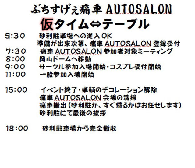 <<ぶちすげぇ96痛車AUTOSALON>> 今回のみ、エントリー車輌から当日抽選で中展示を6台やります。 中展示は当日ビンゴゲームで抽選しますので了承の上参加表明をお願いいたします。 登録用紙はこちら https://www.dropbox.com/s/m5xotiy9x3l1te4/%E3%81%B6%E3%81%A196%E7%99%BB%E9%8C%B2%E7%94%A8%E7%B4%99.jpg?dl=0 募集台数 四輪 50台 +中展示6台 二輪 10台 参加料 四輪 3000円 二輪 1500円 参加者は必ず以下のテンプレで記載下さい。 テンプレ不使用、質問、キャンセルのコメは【すぐに】削