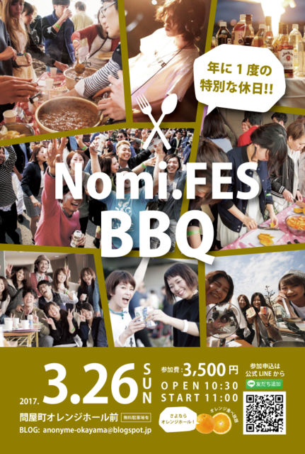 昨年約300人が参加した大人気イベント 『Nomi.FES BBQ × 問屋町』が今年も開催が決定致しましたはじめての人も大歓迎なので、みんなで楽しみましょう 昨年の様子や詳細はブログへ http://anonyme-okayama.blogspot.jp/2017/03/nomifes-bbq.html?m=1