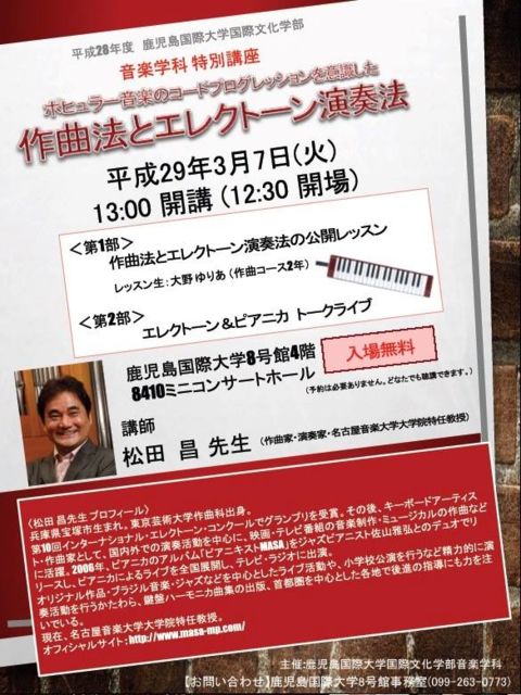 【公開講座情報】平成28年度 国際文化学部音楽学科特別講座 ◇ポピュラー音楽のコードプログレッションを意識した 作曲法とエレクトーン演奏法 <講師:松田 昌 先生> 鹿児島国際大学国際文化学部音楽学科特別講座「ポピュラー音楽のコードプログレッションを意識した作曲法とエレクトーン演奏法」を3月7日(火)13:00、鹿児島国際大学8号館ミニコンサートホールで開催します。今回の講師は、キーボード・アーティスト、作・編曲家、ピアニカ奏者、指導者、著述家、大学院教授として国内外で多面的な音楽活動を展開する松田昌先生。 <