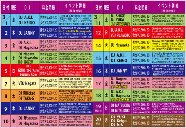 ★3月の第1・第2・第3・第5木曜日は!おなじみGroovyのディスコナイト★ 70年代のSOULミュージックから最新のEDMまでオールヒットメドレー!踊れる曲盛り沢山でお贈りします♬ 【Organized By DISCO Groovy】 【DJ】 JANNY(MAHARAJA ROPPONGI) 【音楽】ALL GENRE (SOUL、竹の子、ダンクラ、EURO、HI-NRG、TECHNO、R&B、EDM、etc…) 【開催時間】 19:00〜24:00 【料金】 男性:¥2,500/2Drinks+ビュッフェ付 女性:¥2,000/2Drinks+ビュッフェ付 (ビュッフェは19時よりご用意しますが数量限定につき無くなり次