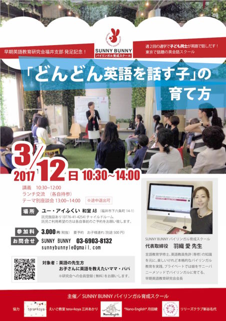 管理人の羽織愛です!皆さん、いつもありがとうございます^^ ここ、mixiの「0〜6歳の英語教育」からスピンオフして誕生した「早期英語教育研究会」、コツコツと成長して、600名の会員が所属する研究会へと成長しました! 公式ページ Facebook「早期英語教育研究会」 ボタンひとつで会員登録OK!もちろん無料! https://www.facebook.com/groups/218831921540151/ 福井県で早期英語教育研究会を立ち上げることになりました!! 記念すべき第一回、主催SUNNY BUNNYということで、私、羽織愛も福井に行って「「バイリンガル教育成