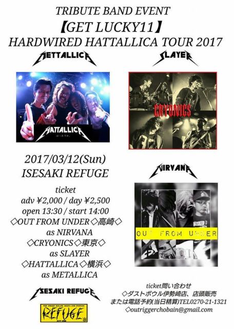 宣伝失礼いたします。 関東で活動するSLAYERトリビュートバンドCRYONICS(クリオニクス)と申します。 この度、初の群馬遠征にて『GET LUCKY11 - HARDWIRED HATTALLICA TOUR 2017』に参加することとなりました。 概要は以下のとおりとなります。 https://www.facebook.com/events/392678534419700/ 【イベント】『GET LUCKY11 - HARDWIRED HATTALLICA TOUR 2017』 【日程】2017年3月12日(日) 【会場】群馬 伊勢崎REFUGE http://www.dustbowl.co.jp/refuge/index.htm 【開場/開演】13:30 / 14:00 【Charge】ADV\2,000