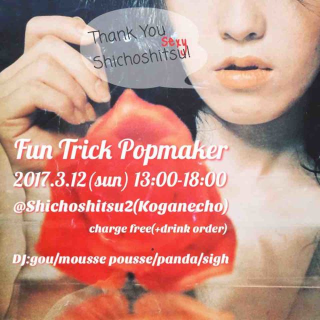 »îݼ¼¤½¤Î2¤ÎÊÄŹ¤Ëȼ¤¤4ǯ¿¶¤ê¤Ë¸¸¤ÎDJ¥¤¥Ù¥ó¥È¤¬Éü³è¤·¤Þ¤¹¡ª ¸÷±É¤Ë¤â»îݼ¼¤Ç¤Î½éDJ¥¤¥Ù¥ó¥È¤¬Fun Trick Popmaker¤Ç¤â¤¢¤ê¡¢Ä¹¤¤´Ö¤ªÀ¤Ïäˤʤ俾ì½ê¤Ê¤Î¤ÇºÇ¸å¤ËDJ¤Ç²¸ÊÖ¤·¤ò¤·¤¿¤¤¤È»×¤¤¤Þ¤¹¡£ º£²ó¤ÏSEXY¤È¸À¤¦¤ªÂê¤Ç³ÆDJ¿Ø¤¬¥»¥ì¥¯¥È¤·¤Þ¤¹¡£ »îݼ¼¤Î¥é¥ó¥Á¥á¥Ë¥å¡¼¤â½¼¼Â¤·¤Æ¤Þ¤¹¤Î¤Ç¡¢°û¿©¤·¤Ê¤¬¤é¤æ¤Ã¤¯¤êʹ¤¤¤ÆÄº¤±¤ì¤Ð¤È»×¤¤¤Þ¤¹¡£ À§È󤪵¤·Ú¤ËÍ·¤Ó¤Ë¤¤¤é¤·¤Æ²¼¤µ¤¤¡£ No Charge(1Drink¡Á) DJs:panda gou mousse pousse sigh