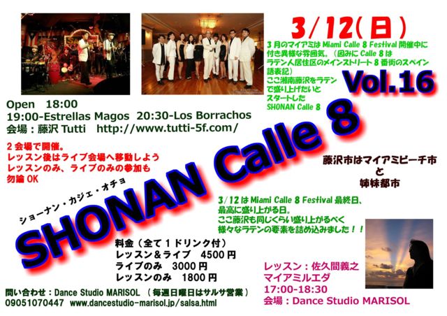 ¾ÅÆîÆ£Âô¤Ç¤ÎÉÔÄê´ü¥¤¥Ù¥ó¥ÈSHONAN Calle 8 Vol.16¡£ º£²ó¤ÏDance Studio MARISOL¤È¥ì¥¹¥È¥é¥ó·ó¥é¥¤¥Ö¥Ï¥¦¥¹Tutti¤Î2²ñ¾ì¤Ç¤Î³«ºÅ¡£ 2017ǯ3·î12Æü(Æü) ¥ì¥Ã¥¹¥ó¡÷Dance Studio MARISOL¡§17:00-18:30¡¡¥Þ¥¤¥¢¥ß¥ë¥¨¥À¡¡¹Ö»Õ¡§º´µ×´ÖµÁÇ·¡¡ http://www.dancestudio-marisol.jp/salsa.html ¥é¥¤¥Ö¡÷Tutti¡¡Open18:00¡¡ Live:19:00- Estrellas Magos(¥Ð¥Á¥ã¡¼¥¿) ¡¡¡¡ 20:30-Los Borrachos(¥×¥¨¥ë¥È¥ê¥³¥µ¥ë¥µ¡¢¥Ó¥Ã¥°¥Ð¥ó¥É¥µ¥ë¥µ)¡¡ http://www.tutti-5f.com/ ÎÁ¶â¡§¥ì¥Ã¥¹¥ó¡õ¥é¥¤¥Ö4500±ß¡¡¥é¥¤¥Ö¤Î¤ß3000±ß¡¡¥ì¥Ã¥¹¥ó¤Î¤ß1800±ß¡¡