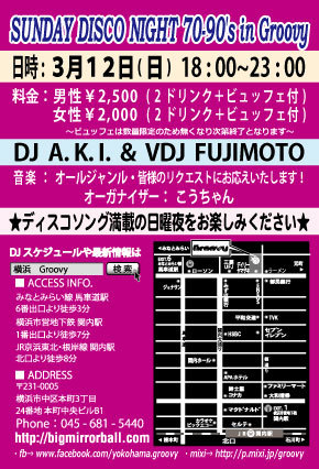 2017ǯ£³·î¤Ï Â裲¡õÂ裴¤ÎÆüÍËÆü¤Ë³«ºÅ¤È¤Ê¤ê¤Þ¤¹¡ÚSUNDAY DISCO NIGHT¡ÛÆüÍËÆü¤Ë¤·¤«¤ª½Ð¤«¤±¤Ç¤¤Ê¤¤Êý¡¹¤Ê¤É¡¢µÙÆü¤Ç¤âDISCO¤ÊNIGHT¤ò¸ʬ¤Ë¤ª³Ú¤·¤ß¤¤¤¿¤À¤±¤Þ¤¹(^_-)-¡ù♬ ¡Ú¥ª¡¼¥¬¥Ê¥¤¥¶¡¼¡Û¤³¤¦¤Á¤ã¤ó ¡ÚDJ A.K.I. ¡õ VDJ FUJIMOTO¡Û ¡Ú²»³Ú¡Û¥ª¡¼¥ë¥¸¥ã¥ó¥ë ¡ÊSOUL¡¢Ãݤλҡ¢EURO¡¢HI-NRG¡¢R&B¡¢etc... ³§ÍͤΥꥯ¥¨¥¹¥È¤Ë¤ª±þ¤¨¤·¤Þ¤¹¡ª¡Ë ¡Ú³«ºÅ»þ´Ö¡Û18:00¡Á23:00 ¡ÚÎÁ¶â¡Û ÃËÀ¡§¡ï2,500/2Drinks¡Ü¥Ó¥å¥Ã¥Õ¥§ÉÕ ½÷À¡§¡ï2,000/2Drinks¡Ü¥Ó¥å¥Ã¥Õ¥§ÉÕ ¡Ê¥Ó¥å¥Ã¥Õ¥§¤Ï18»þ¤è¤ê¤´ÍѰդ·¤Þ¤¹¤¬¿ôÎ̸ÂÄê¤Ë¤Ä¤Ìµ¤¯¤Ê