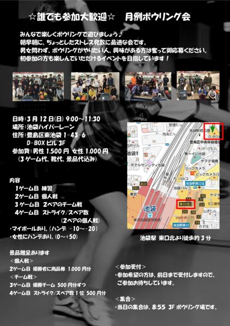 ¤ß¤ó¤Ê¤Ç³Ú¤·¤¯¥Ü¥¦¥ê¥ó¥°¤ÇÍ·¤Ó¤Þ¤·¤ç¤¦ (^O^)¡¿ Ä«¡¢ÁáÄ«¤Ë¤Á¤ç¤Ã¤È¤·¤¿¥¹¥È¥ì¥¹È¯»¶¤ËºÇŬ¤Ê²ñ¤Ç¤¹¡£ Ã˽÷Ìä¤ï¤º¡¢¥Ü¥¦¥ê¥ó¥°¤¬¤ä¤ê¤¿¤¤¿Í¡¢¶½Ì£¤¬¤¢¤ëÊý¤Ïʳ¤Ã¤Æ¸æ±þÊ礯¤À¤µ¤¤¡£ ½é»²²Ã¤ÎÊý¤â³Ú¤·¤ó¤Ç¤¤¤¿¤À¤±¤ë¥¤¥Ù¥ó¥È¤òÌܻؤ·¤Æ¤¤¤Þ¤¹¡£¢ö Æü»þ 3·î12Æü(Æü) 9:00¡Á11:30 ¾ì½ê ¥Ï¥¤¥Ñ¡¼¥ì¡¼¥ó ½»½ê ËÅç¶èÅìÃÓÂÞ1-43-6 D-BOX¥Ó¥ë3F ½¸¹ç 8:55 ¸½Ãϥܥ¦¥ê¥ó¥°¾ì 3F¼õÉÕ ¥¢¥¯¥»¥¹ ÃÓÂÞ±Ø ÅìË̸ý¤«¤éÅÌÊâ3ʬ Ê罸´ü¸Â Á°Æü¤Þ¤Ç¼õÉÕ »²²ÃÈñ ÃËÀ1,500±ß ½÷À1,000±ß ¡¡(3¥²¡¼¥àÂå¡¢·¤Âå¡¢·ÊÉÊÂå¹þ¤ß) £±¥²¡¼¥àÌÜ