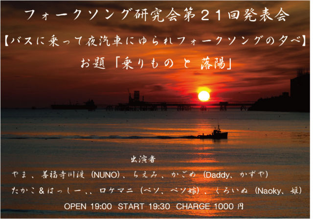 3/15 ËÜÆü¤Ï Â裲£±²ó¥Õ¥©¡¼¥¯¥½¥ó¥°¸¦µæ²ñȯɽ²ñ¡¡ ¡Ú¥Ð¥¹¤Ë¾è¤Ã¤ÆÌëµ¥¼Ö¤Ë¤æ¤é¤ì¥Õ¥©¡¼¥¯¥½¥ó¥°¤Îͼ¤Ù¡Û OPEN 19:00 START 19:30 CHARGE 1000±ß¡¡ ¤ªÅ¹¼«ÂΤÏÄ̾ï±Ä¶È¤Ç¤¹¤Î¤Ç Ä̾ï¥Á¥ã¡¼¥¸£±£°£°£°±ß¡Ê¥É¥ê¥ó¥¯ÊÌ¡Ë ¡Ê¤¿¤À¤·BGM¤Ï¥Õ¥©¡¼¥¯¤Ç¤¹¡Ê¾Ð¡Ë¡Ë