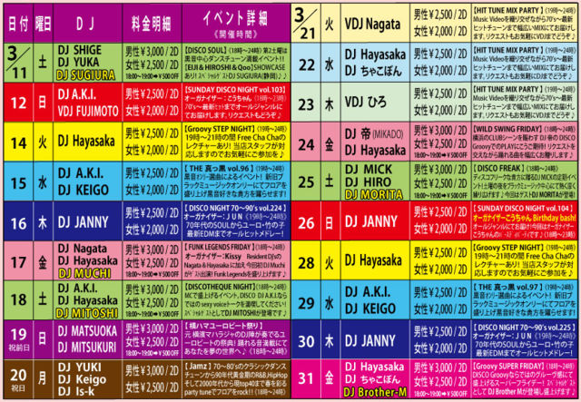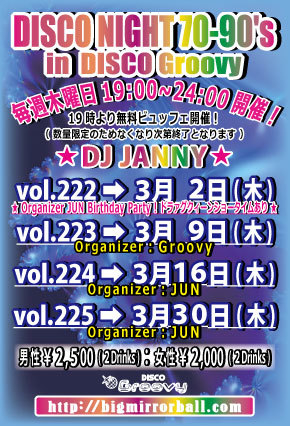 【おなじみGroovyのディスコナイト】70年代のSOULミュージックから最新のEDMまでオールヒットメドレー!踊れる曲盛り沢山でお贈りします♬ 【オーガナイザー】JUN 【DJ】JANNY(MAHARAJA ROPPONGI) 【音楽】ALL GENRE (SOUL、竹の子、ダンクラ、EURO、HI-NRG、TECHNO、R&B、EDM、etc…) 【開催時間】 19:00〜24:00 【料金】 男性:¥2,500/2Drinks+ビュッフェ付 女性:¥2,000/2Drinks+ビュッフェ付 (ビュッフェは数量限定につき無くなり次第終了となります)