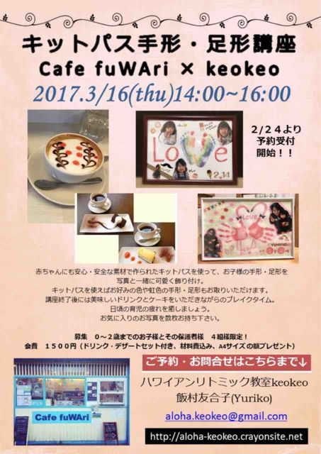 キッズスペースがあるオシャレなカフェ、Cafe fuWAriさんとのコラボイベント! キットパスを使ってお子様の虹色の手形・足形を取って、写真と一緒に一つの作品にしあげましょう。 作品を飾るA4の額をプレゼント致します! 講座後はケーキとお飲物を飲みながら皆さんとおしゃべり。 なかなかカフェでゆっくりする機会の少ないママ達のためのイベントです。 お気軽にご参加下さい☆ 詳しい内容はこちらから↓ http://ameblo.jp/aloha-keokeo/entry-12247533904.html メールでのお問い合わせもお気軽にどうぞ↓ aloha.keokeo@gmail.com
