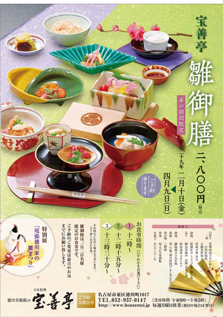皆さん、こんにちは! 3/19(日)に、徳川美術館で「尾張徳川の雛祭り」&宝善邸懐石ランチを楽しみませんか。 日程 3/19(日)11時45分〜 お店 宝善邸 http://houzentei.jp/dishes/index.html 会費 2800円+徳川美術館入館料1200円 会費は、記名済みの封筒に入れ、お釣りの無いようにお願いします。 御手数をお掛けしますが宜しくお願い致します。 尚、皆様ご協力頂いている中、続けて3回上記にご協力頂けなかった方は尊重の意思が無いと見做し、以降私が幹事をするイベントでの参加はご遠慮頂こうと思いますので、宜しく