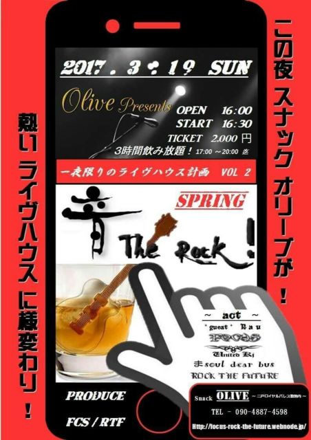 昨年7月に産声をあげた、 一夜限りのライヴ ハウス計画 音 The Rock ! の第2弾決行! お一人様 2,000円ポッキリで3時間飲み放題 と言う他に類を見ない太っ腹ライヴハウス計 画イベントです! 今期のスタートとして、是非皆様お誘いの上 パーッと馬鹿騒ぎしましょう (笑) 〜 F C S / R T F 〜