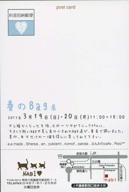 「春のbag展」 鎌倉NABI 3月19日(日)20日(月)11:00〜18:00 鎌倉市御成町7-5 (鎌倉駅西口御成り通り徒歩3分) 大きくて軽いバックや差し色の小さめバックが揃います。 春色の自分だけのバックを探しにに来てくださいね。 *参加作家* komof・ふんわりcafe・a.a made・Rioc**・Sherpa・an・yukiami・アトリエPanda他 Pandaはアクセサリーで今年も参加させていただきます 春のBagにちょこっと着けられそうなバックチャームやブローチなど制作中です