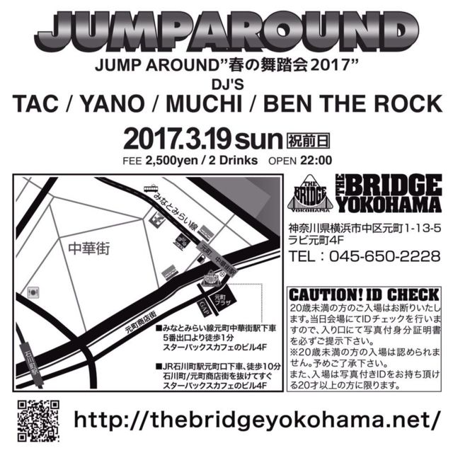 皆さまこんにちは。 またしてもこの季節がやって参りました―――!!!! JUMP AROUND"春の舞踏会2017 @The Bridge Yokohama 2017年3月19日 祝前日曜日 そもそも"ジャンパラ"って何さ?な人はコチラ。 ↓↓↓ 『CIRCUSで遊んでた時のNJSが聞きたいです!!!!』 ってとこから始まったコレ。 せっかくなんで当時のCIRCUS歴代Chief DJばっかで構成してNJSや90sばっかかけてみよ〜。 ってな内容で1997年に始めたので御座いますwww ま。そんなワケですんで"お祭り"の開催ですよ??? もちろん今回も毎度御馴