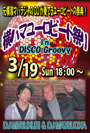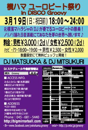 元横濱マハラジャのDJ'sが奏でるユーロビートの祭典です!ノリノリ踊れる音満載にて夢の一夜をお贈りします♪ 【DJ's】 MATSUOKA / MITSUKURI 【開催時間】 18:00〜24:00 【ハッピーアワー料金 / 18:00〜19:00にご来店の方】 男性:¥2,500 / 2Drinks+ビュッフェ付 女性:¥2,000 / 2Drinks+ビュッフェ付 【料金 / 19:00以降ご来店の方】 男性:¥3,000 / 2Drinks+ビュッフェ付 女性:¥2,500 / 2Drinks+ビュッフェ付 (ビュッフェは19時頃よりご用意しますが数量限定のため無くなりしだい終了となります。ご了承ください。