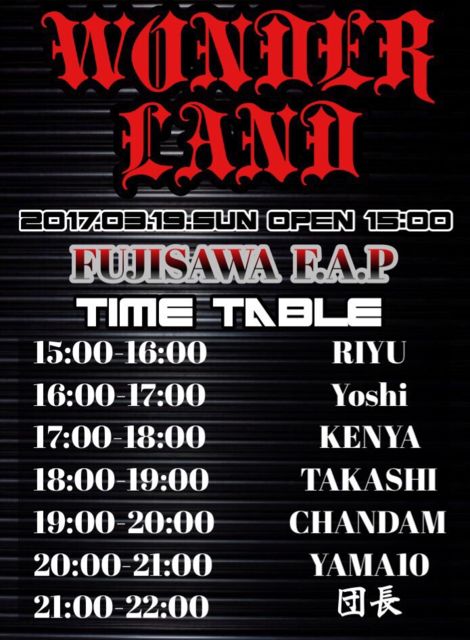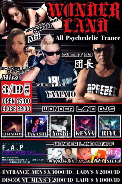 ⇒ https://www.facebook.com/events/1846178182296771/ ⭕3/19(Sun)藤沢 F.A.P WONDER LAND 15:00〜22:00ディパーティ All Psychedelic ⇒ http://ameblo.jp/trancefamily/entry-12244441435.html 横須賀を拠点に置いていたParty WONDER LANDが 関内VIRUSにて力をつけ 藤沢F.A.Pにて開催! RAVER音を追求した Psychedelic Tranceならではの世界感や 一体感、爽快感を堪能し 心地良い音楽を提供していく PSYCHEDELIC PARTYこそが WONDER LANDのStyle! ◆OPEN15:00-22:00 *Door ♀\2,000ー1D ♂\3,000ー1D