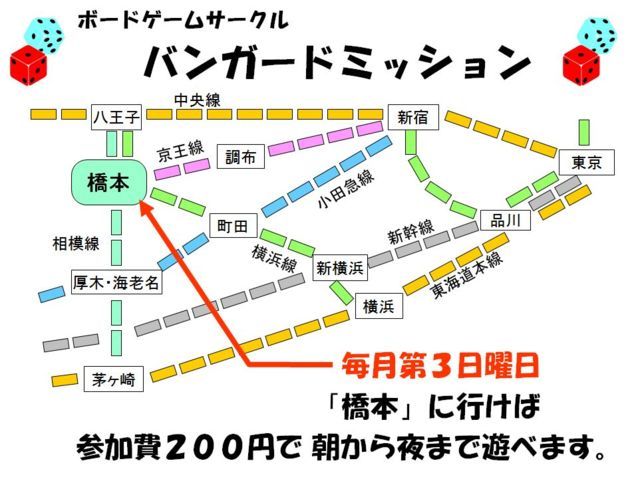 2017年3月定例会(第3日曜日)のお知らせです。 日時:2017年3月19日(日)9時〜21時頃 場所:杜のホールはしもと(橋本駅前のミウィビル8階) セミナールーム2(73平米) セミナールーム1(40平米) 参加費:200円(家族割引あり) 幹事:新井さとし 会員制ではないので誰でも参加できます。例会にはたいてい二十数人ぐらい来ています。初めて参加する方は15時以前に来場して頂けるとありがたいです。どんなゲームが遊ばれているかは、まとめトピや過去のイベントを参照して下さい。 ・例会のルール http://mixi.jp/view_bbs.pl?id=