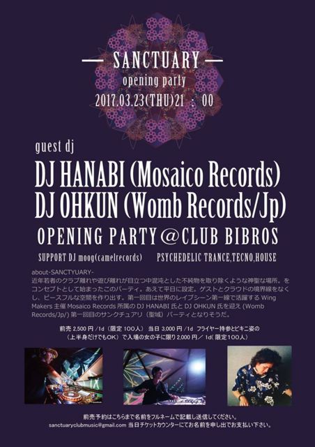 adv/2500yen door/3000yen w/f 2000yen bikini lady 2000yen guest dj DJ HANABI (Mosaico Records/Gentenkaiki/Wing Makers) DJ OHKUN (Womb Records/Wing Makers) moog(camelrecords) color space design (deco) food organic food. 若者のクラブ離れや遊び離れが目立つ中気軽に立ち入れるパーティ 敢えて平日に設定.DJとクラウドの境界をなくし 混沌とした不純物を取り除く聖域)をコンセプトして始まった-SANCTUARY-! 第一回目のopening partyはブラジルを拠点とする Mosaico Records所属のDJ兼プロモーターでGENTENKAIKIやEart