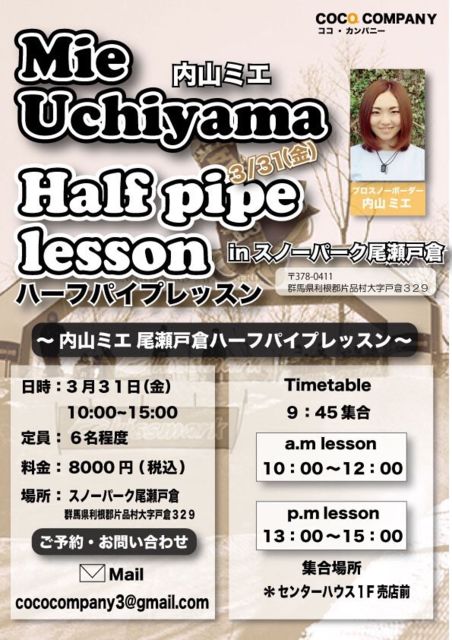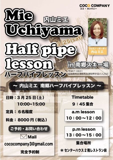 みなさん、こんにちは〜^ ^ 25日(土)南郷スキー場 31日(金)スノーパーク尾瀬戸倉 スノーボードハーフパイプCAMPを2箇所で開催しますので現地にいます^ ^! 初めての方もパイプのキッカケにしてください^ ^ レッスンに関する詳細はこちらです http://blog.livedoor.jp/cocohemp/ 予約もまだ少ないので、 当日現地で会える方いましたらお気軽に声をかけてくださいね^ ^