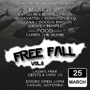 3/25-sat- FREE FOLL vol.8 OPEN 22:00 GENTS 1,500yen/1Drink LADIES FREE -HIP HOP,BLACK MUSIC- -DJ- KATSU THE BOMB YAYOI MOSSYATSU YOSHITO P.I.Q -LIVE- SSZZAA BOOGIE MASON SMOKEY TEMPLE -FOOD- CURRY THE BOMB