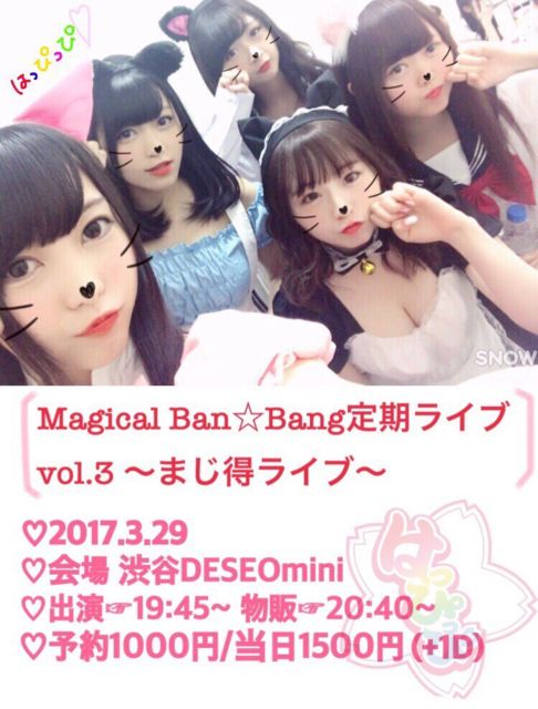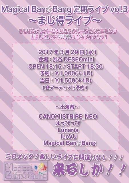 ¡ÖMagical Ban¡ùBangÄê´ü¥é¥¤¥Ö vol.3 ¡Á¤Þ¤¸ÆÀ¥é¥¤¥Ö¡Á¡× Æü»þ¡§3/29(¿å) ³«¾ì18:15 / ³«±é18:30 ²ñ¾ì¡§½ÂëDESEOmini ÎÁ¶â¡§Í½Ìó1,000±ß / ÅöÆü1,500±ß (1DÊÌ) ½Ð±é¡§Magical Ban¡ùBang / CANDYllSTRIPE_NEO / ¤Ï¤Ã¤Ô¤Ã¤Ô /¡Ä