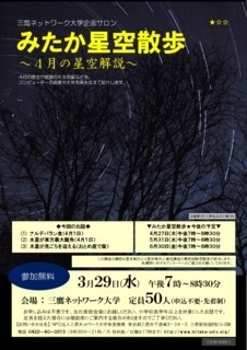 4月の星空や話題の天文現象などを、 コンピューターの画像や天体写真を交えて紹介します。 参加は無料です。 ◆今回のお話◆ (1) アルデバラン食(4月1日) (2) 水星が東方最大離角(4月1日) (3) 木星が見ごろを迎える(おとめ座で衝) この講座の講師は星空案内人および星空案内人養成講座の最終試験受験者が担当します。 各講師に対するアンケートへのご協力をお願いしております。 ※定員を超えた場合には補助席にご案内する場合がありますのでご了承ください。 詳しくは↓ https://www.mitaka-univ.org/kouza/D16