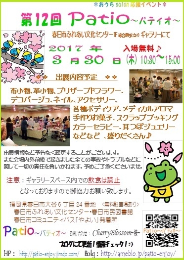 「第12回 Patio〜パティオ〜」のお知らせ♪ 予告通り今年Patio〜パティオ〜 の開催致します! 今回も楽しい雰囲気になるように心掛けたいと思います(*^_^*) 詳しくはパティオのブログをご覧くださいね☆ http://ameblo.jp/patio-enjoy/ ☆おうちSalon応援イベント☆ 第12回Patio〜パティオ〜開催決定! 2017年 3月30日(木) 10:30〜15:00 春日市ふれあい文化センター1F ギャラリー 第12回Patio〜パティオ〜 第12回Patio〜パティオ〜は 初の長期お休み中の開催!春休み開催です☆ 今回も色ん