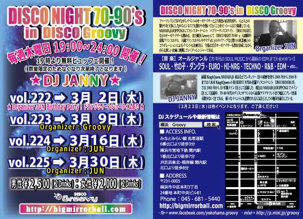 【おなじみGroovyのディスコナイト】70年代のSOULミュージックから最新のEDMまでオールヒットメドレー!踊れる曲盛り沢山でお贈りします♬ 【オーガナイザー】JUN 【DJ】JANNY(MAHARAJA ROPPONGI) 【音楽】ALL GENRE (SOUL、竹の子、ダンクラ、EURO、HI-NRG、TECHNO、R&B、EDM、etc…) 【開催時間】 19:00〜24:00 【料金】 男性:¥2,500/2Drinks+ビュッフェ付 女性:¥2,000/2Drinks+ビュッフェ付 (ビュッフェは数量限定につき無くなり次第終了となります)
