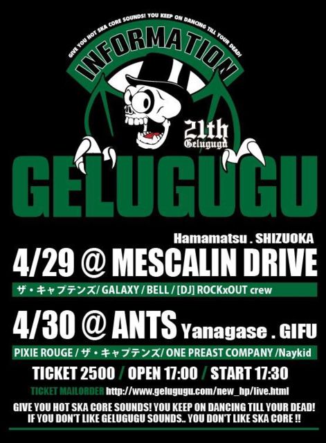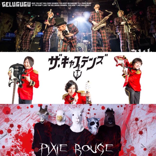 2017年4月30日(日) 岐阜yanagase ants 【出演】 GELUGUGU ザ・キャプテンズ ONE PREAST COMPANY Naykid PIXIE ROUGE OPEN17:00/START17:30 TICKET:adv2500yen/door3000yen (入場時ドリンク代別途必要です) PIXIE ROUGEは5組中3番目18:50〜の出演予定です ※入場は並び順となります 岐阜yanagase ants:岐阜県岐阜市柳ヶ瀬通7-4柳ヶ瀬観光ビルB1F