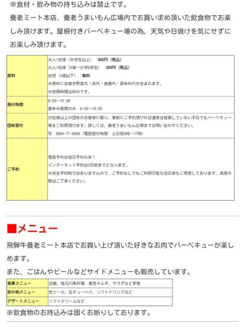 お昼に養老ミートのうまいもん広場でBBQです! 11時〜お席の予約できました! 11時少し前に現地に到着し、みんなでワイワイお肉を選びます♪ 集合場所はオートレストラン長島 http://www.autorest-nagashima.jp/ 【集合時間】9時30分 【集合場所】オートレストラン長島 よろしく〜( ´ ▽ ` )ノ 食べた後は養老公園で遊ぶよ〜 どこでスイーツにしようかな〜(艸*>∀<*∞)アハッ 養老公園です。 http://www.yoro-park.com/sp/ 養老天命反転地 http://www.yoro-park.com/sp/facility-map/hantenchi/ ★お昼ご飯はこ
