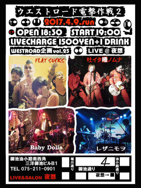 4/9(Æü) ¡Ö¥¦¥¨¥¹¥È¥í¡¼¥ÉÅÅ·âºîÀï2¡× ½Ð±é¡§FLAT SUCKS / ÅÇ¥¤¥¿ÂåΥà¥Ê / Baby Dolls / ¥ì¥¶¥Ë¥â¥ò OPEN 18:30 / START 19:00 \1500 (+1drink \500)