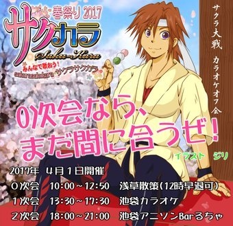もうすぐ桜の季節になりますね 桜といえば… サクラ大戦ですね! 毎年恒例となりました花見散策サクカラを サクカラ春祭り2017 〜みんなで歌おう! サクラサクカラ〜と題しまして 今年も企画させていただきました 今回のサクカラは3部会構成です !!!! 2月4日(土) 22時より受付開始です !!!! 【開催場所】 池袋 (0次会は浅草) 【状況報告】2017/2/1更新 2月4日 22時より受付開始です フライングは無効ですのでご注意くださいませ 1次会と2次会は初参加者枠として3月4日まで5席ずつ確保させていただきます